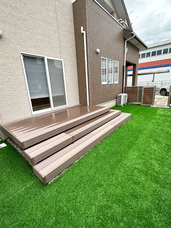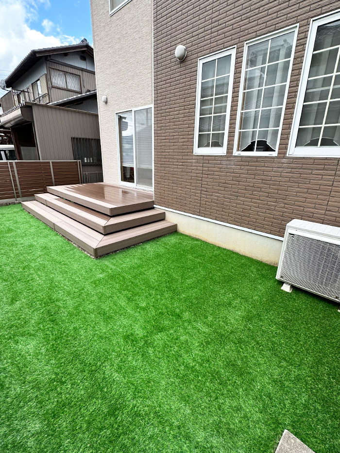・人工芝の明るい色に、デッキの色を合わせることによって、ウッドデッキの存在を最大限に生かしました。