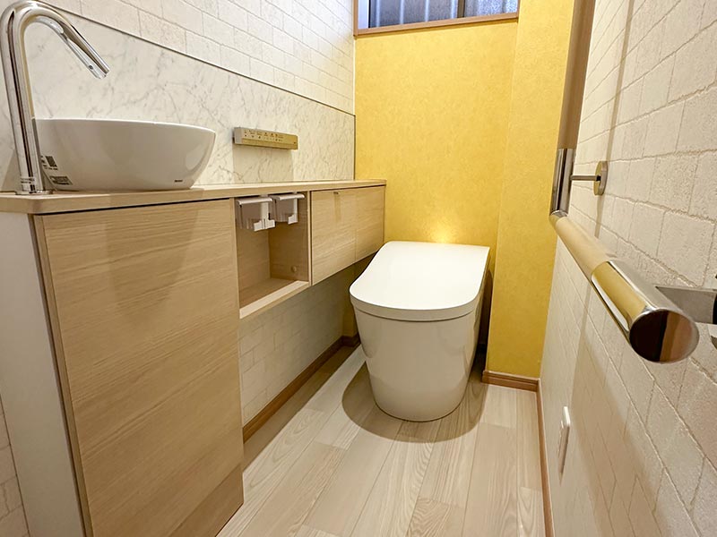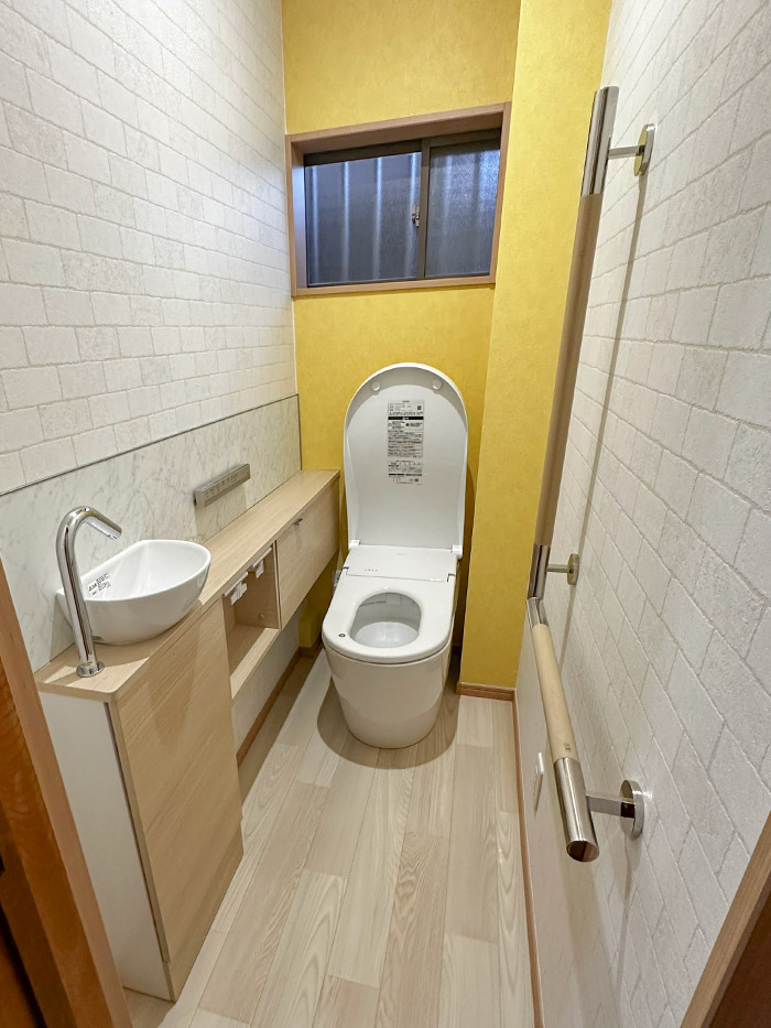 今回のリフォームでトイレ内の段差を解消でき、手すりつきの安全なトイレにすることができました。